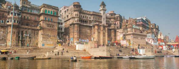 All'alba escursione in barca sul sacro fiume Gange costeggiando i Bathing Ghats , le gradinate di pietra dove i pellegrini e i devoti si recano a salutare il sorgere del sole con la preghiera e le abluzioni rituali. Visita dei luoghi e monumenti più significativi della città: i ghat dove, accanto alle pire, si svolgono i riti funebri; il tempio di Durga , anche denominato "Tempio del dio Scimmia"; il tempio d'oro di Vishvanath , la moschea dell'imperatore Aurangzeb e l'enorme "Nandi", il toro sacro a Shiva. Durante le visite si percorrerà il labirinto di stradine che si snodano nel Chowk , il bazar più animato della città, famoso per i profumi e gli incensi, le sete ricamate, il rame e gli ottoni lavorati.